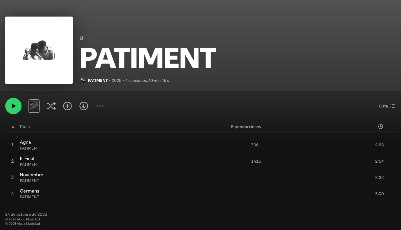 The project consisted of developing the visual identity for PATIMENT E.P., the debut release of PATIMENT, a post-punk/post-rock band from Sabadell. The main objective was to translate the band’s raw and emotional sound into a graphic language that felt both expressive and restrained.